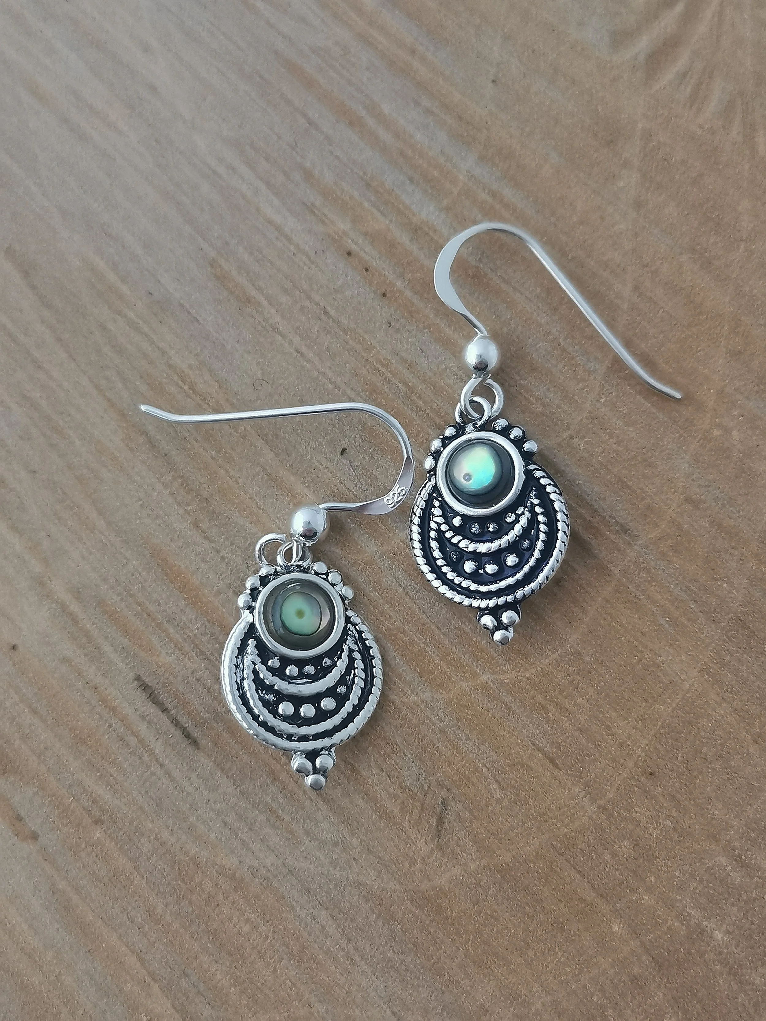 Small sterling silver dangly earrings with abalone shell detail. Light weight to wear.